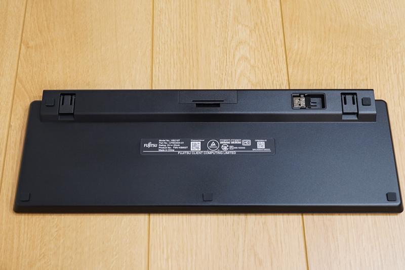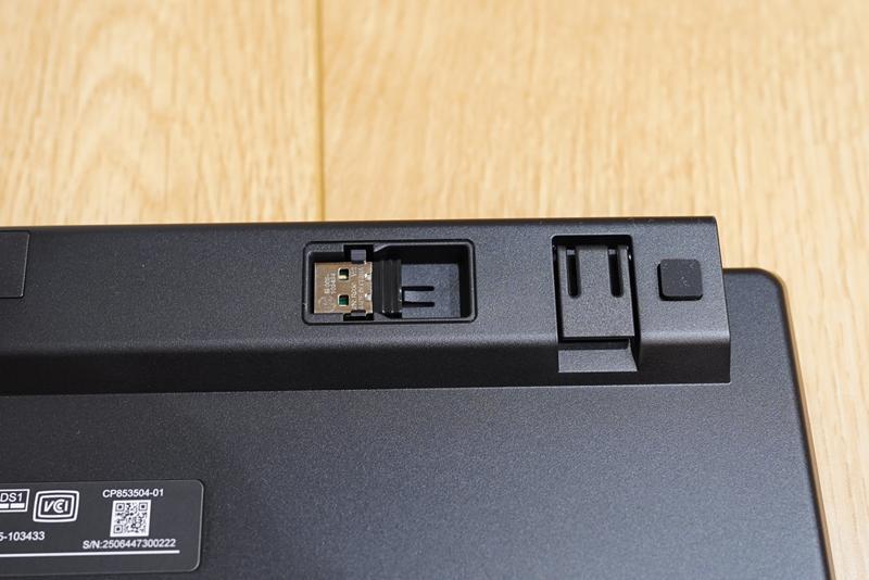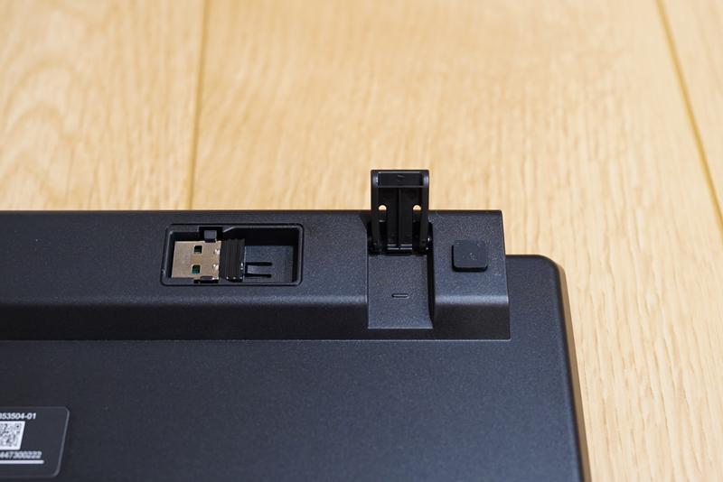 裏面。基本は私はブルートゥース接続で使用しますが、USBレシーバーも無くさないように格納できる場所があるのはポイント高いですね。